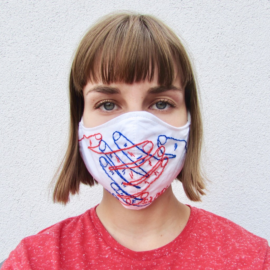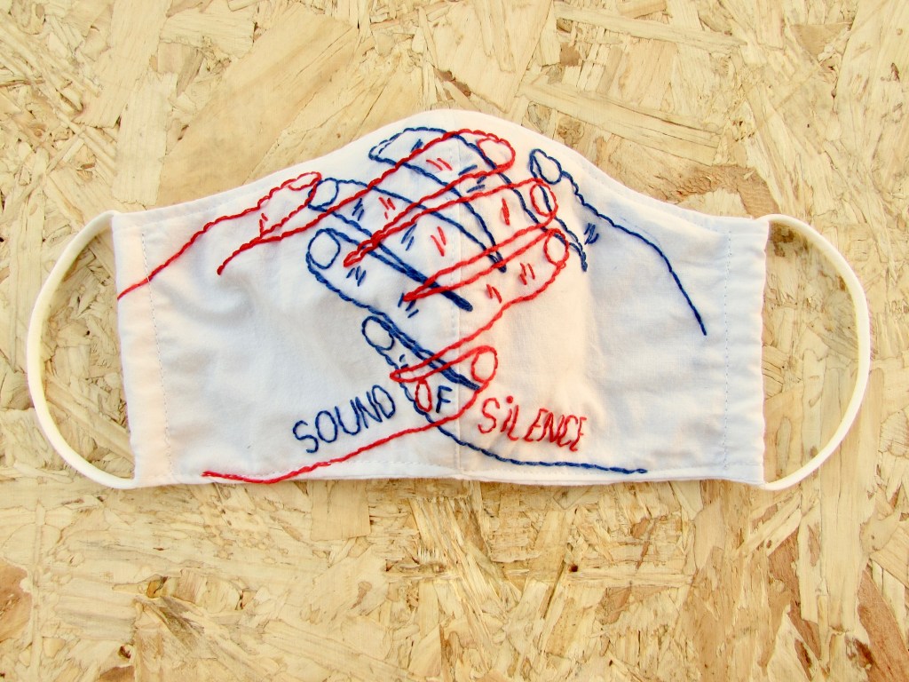Misschien heeft iemand van jullie wel zin om ook een ‘sound of silence’ mondmasker te maken bij wijze van stil protest. Dan mag je mij voor één keer gerust helemaal na-apen. Ik maakte het mondmasker volgens het patroon van het UZA. Ik naaide de twee grootste delen aan elkaar en tekende mijn handen over op het stof (ik heb best kleine handen, ik weet het). En dan begin je gewoon te borduren.