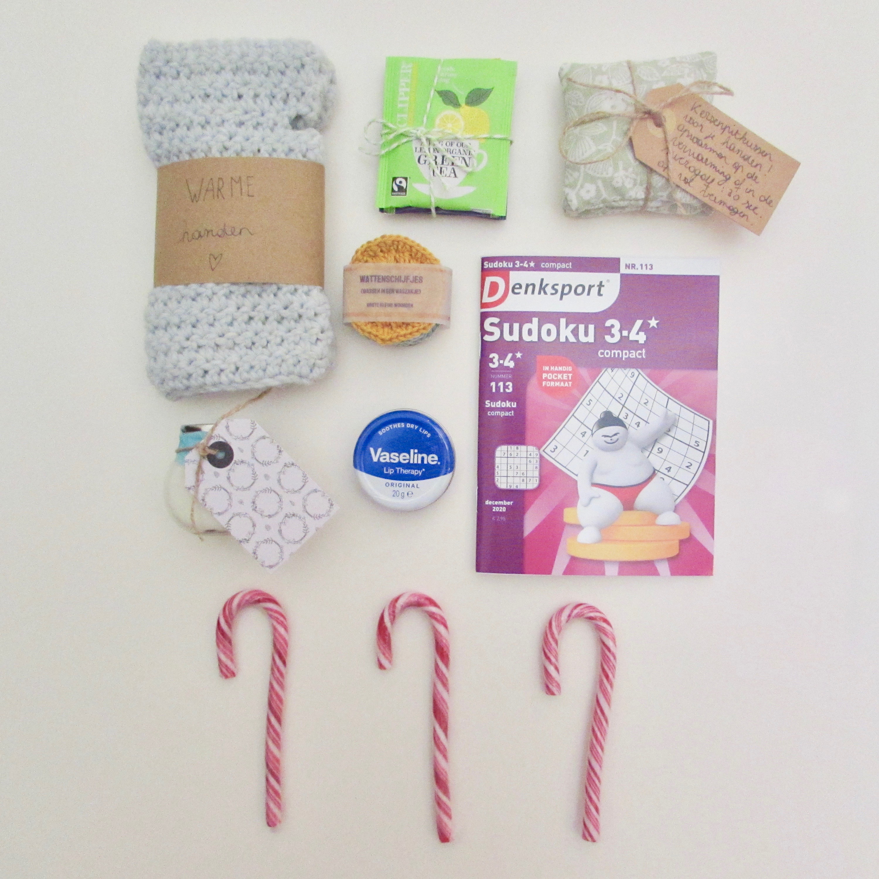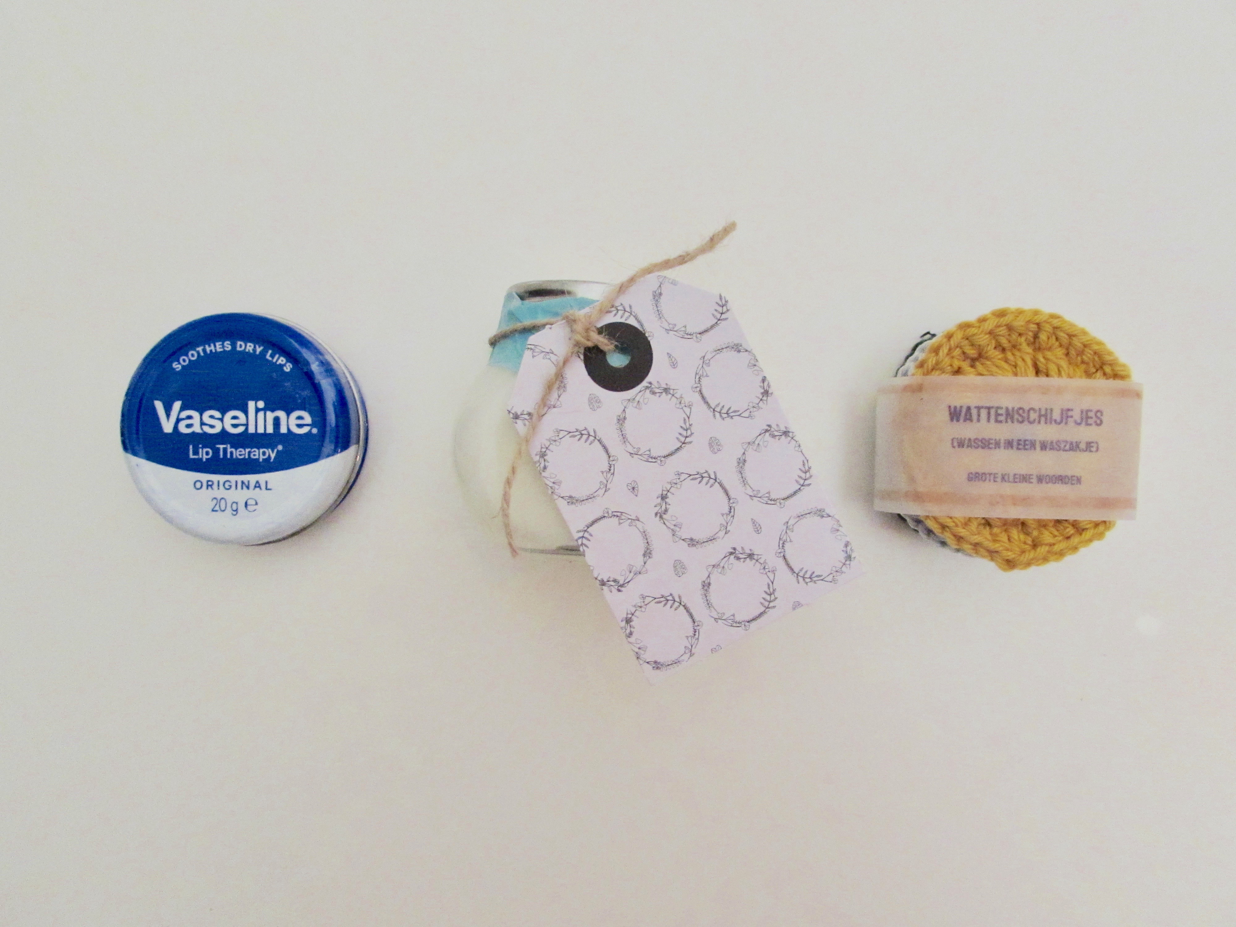 Vaseline is in de winter nooit overbodig. Daarnaast haakte ik herbruikbare watjes en maakte ik zelf deo. Ik vond het recept bij De Groene Meisjes. En het werkt echt! Ik gebruik hem al best lang en ben heel tevreden. Ik schreef op het labeltje ook het recept zodat de krijger het kan namaken.