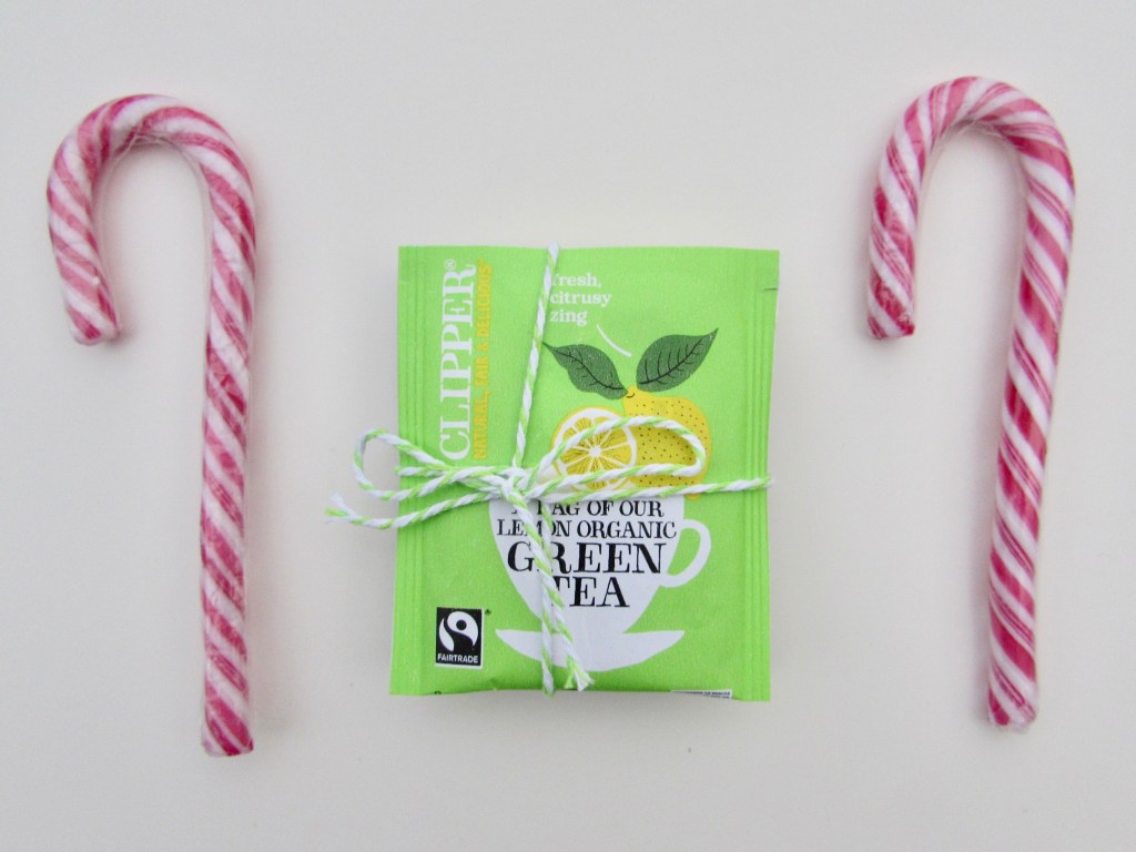 Ik verzamelde wat verschillende soorten thee en bond ze samen met een touwtje. Ik vond in de winkel nog wat kerstlolly’s en het lekkers kwam in orde.