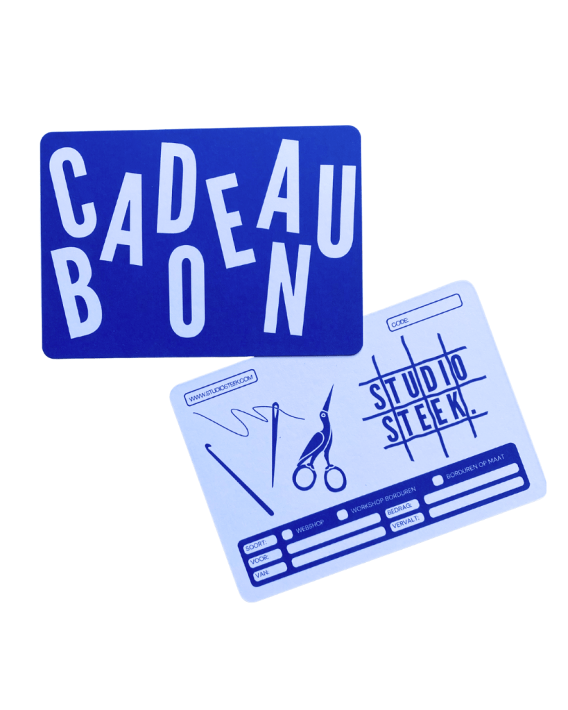 Je kan een bon geven voor een workshop, producten uit de webshop of voor een borduursel op maat. Uiteraard mag je ook de ontvanger laten kiezen aan wat ze het uitgeven.
