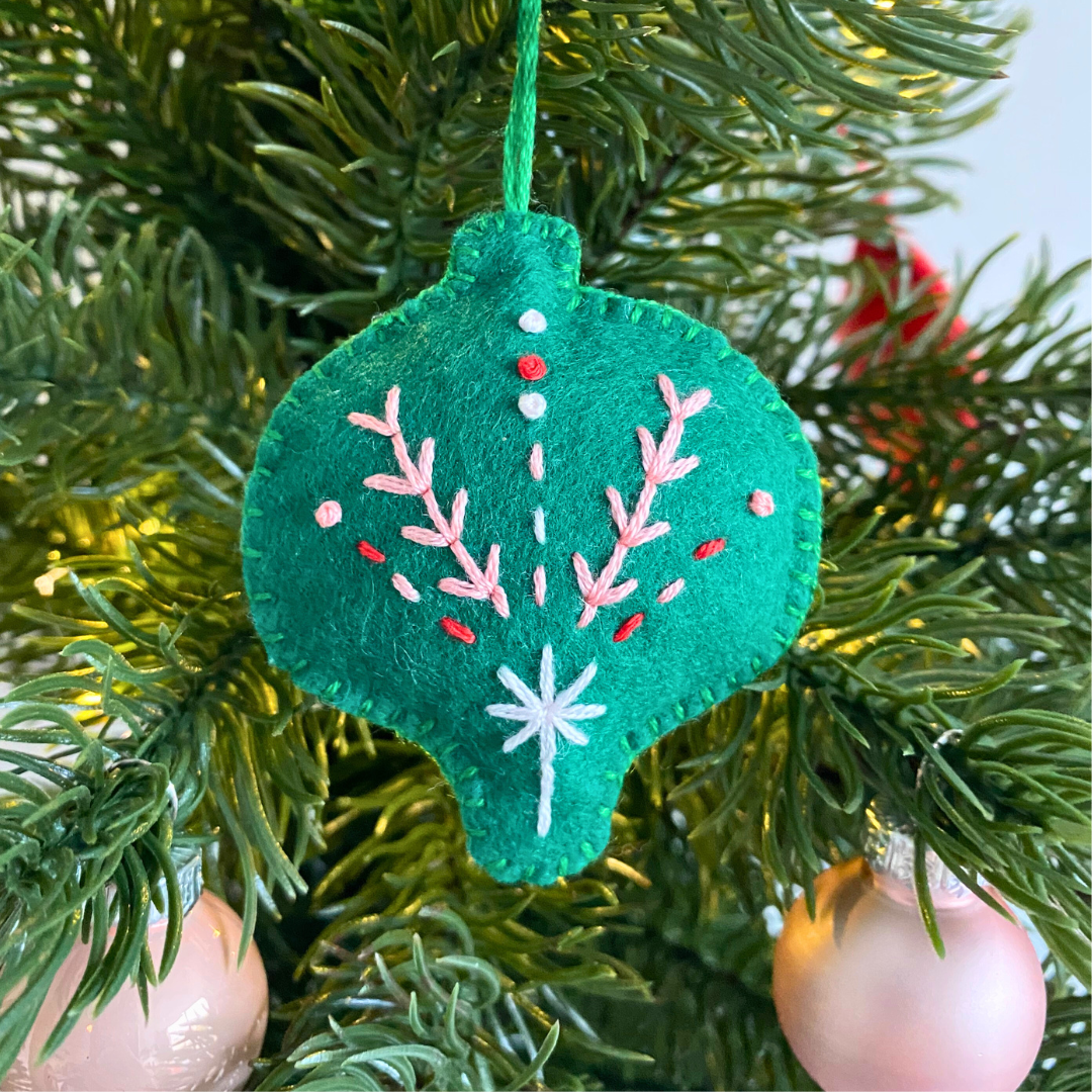 Voor de roze en de groene kerstbal gebruiken we de stiksteek en de franse knoop: