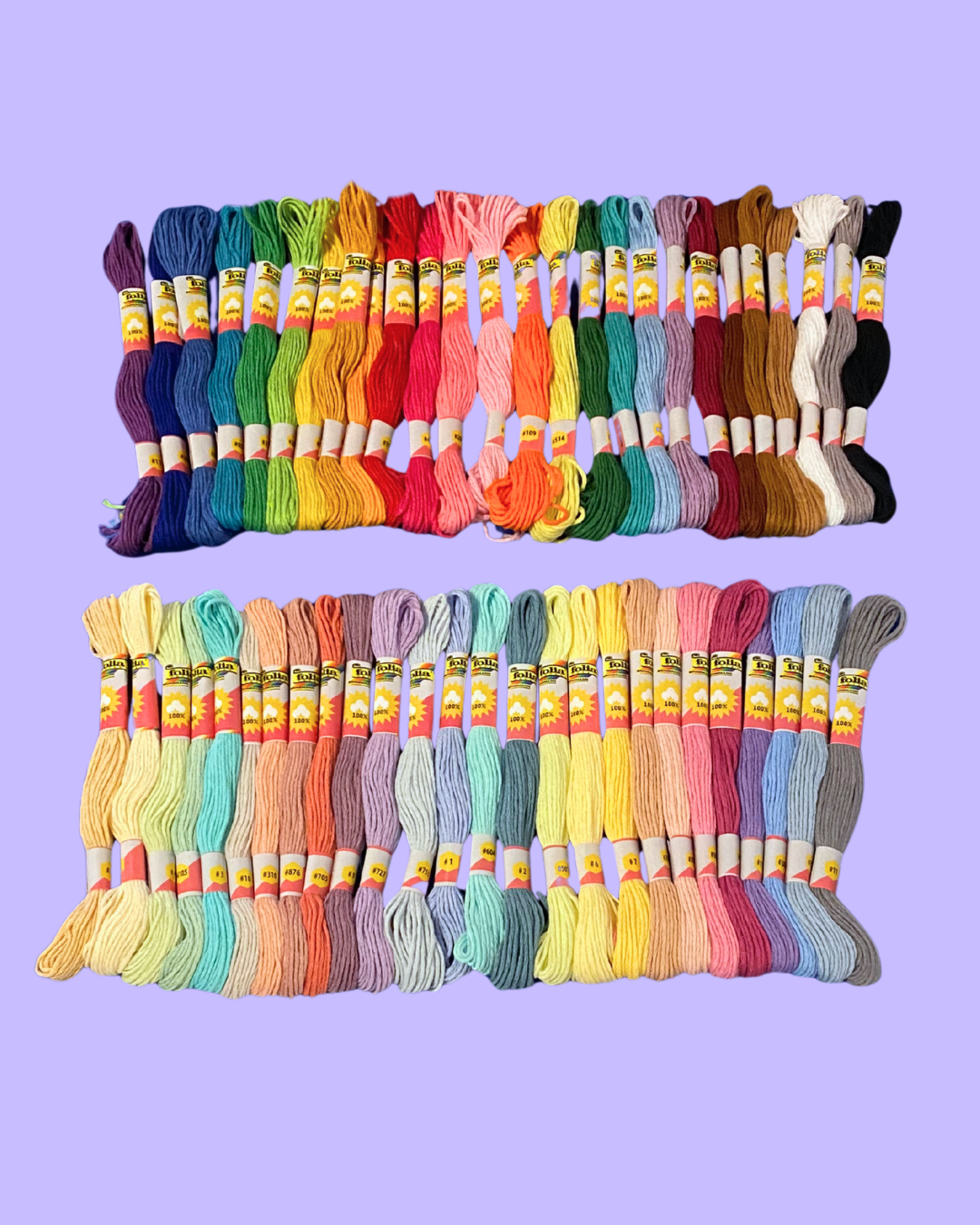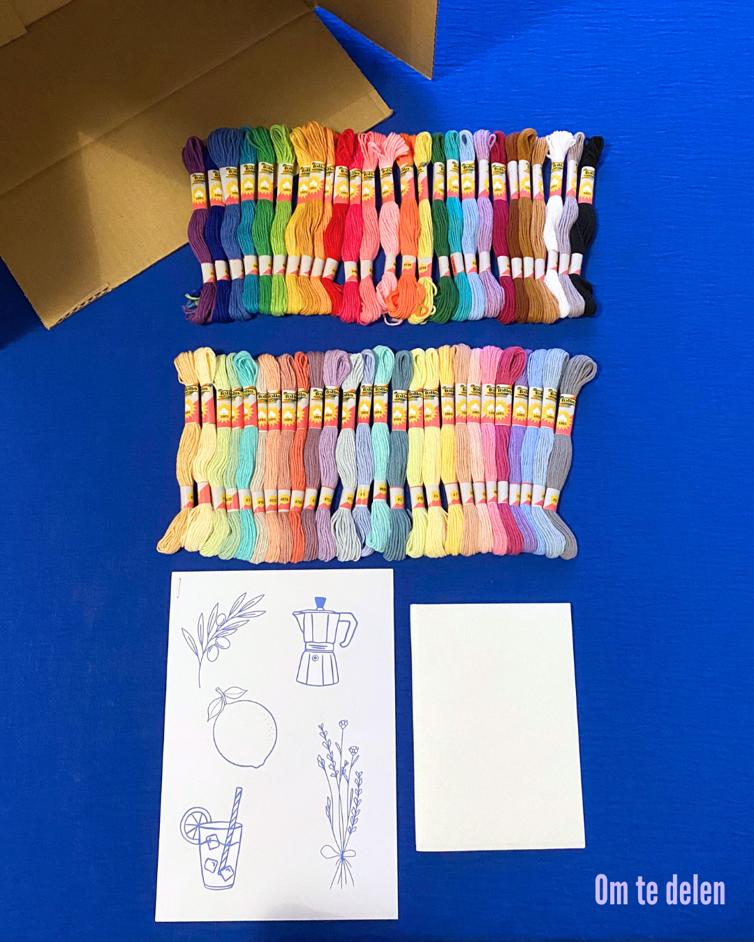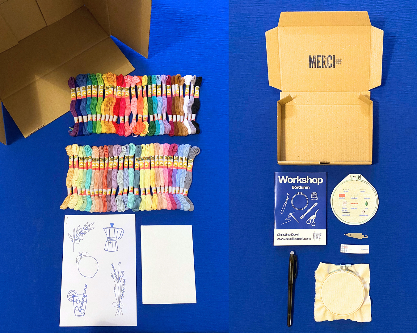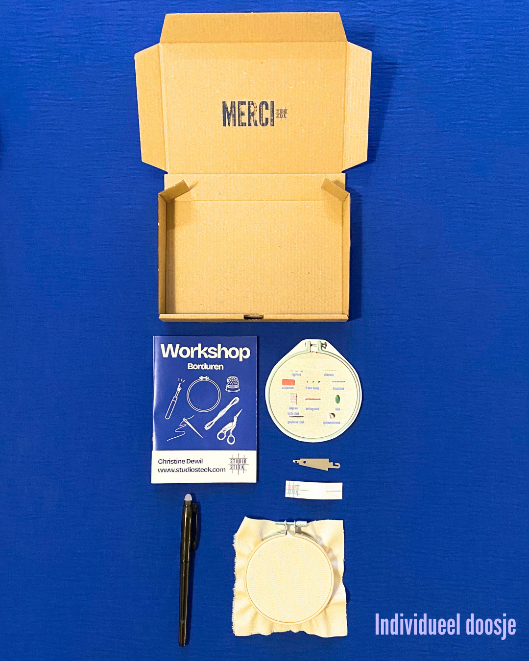 Jullie ontvangen één grote doos met gedeeld borduurmateriaal én voor iedereen een individueel doosje. De inhoud en uitleg zijn dezelfde als bij de borduurworkshops die ik live geef.