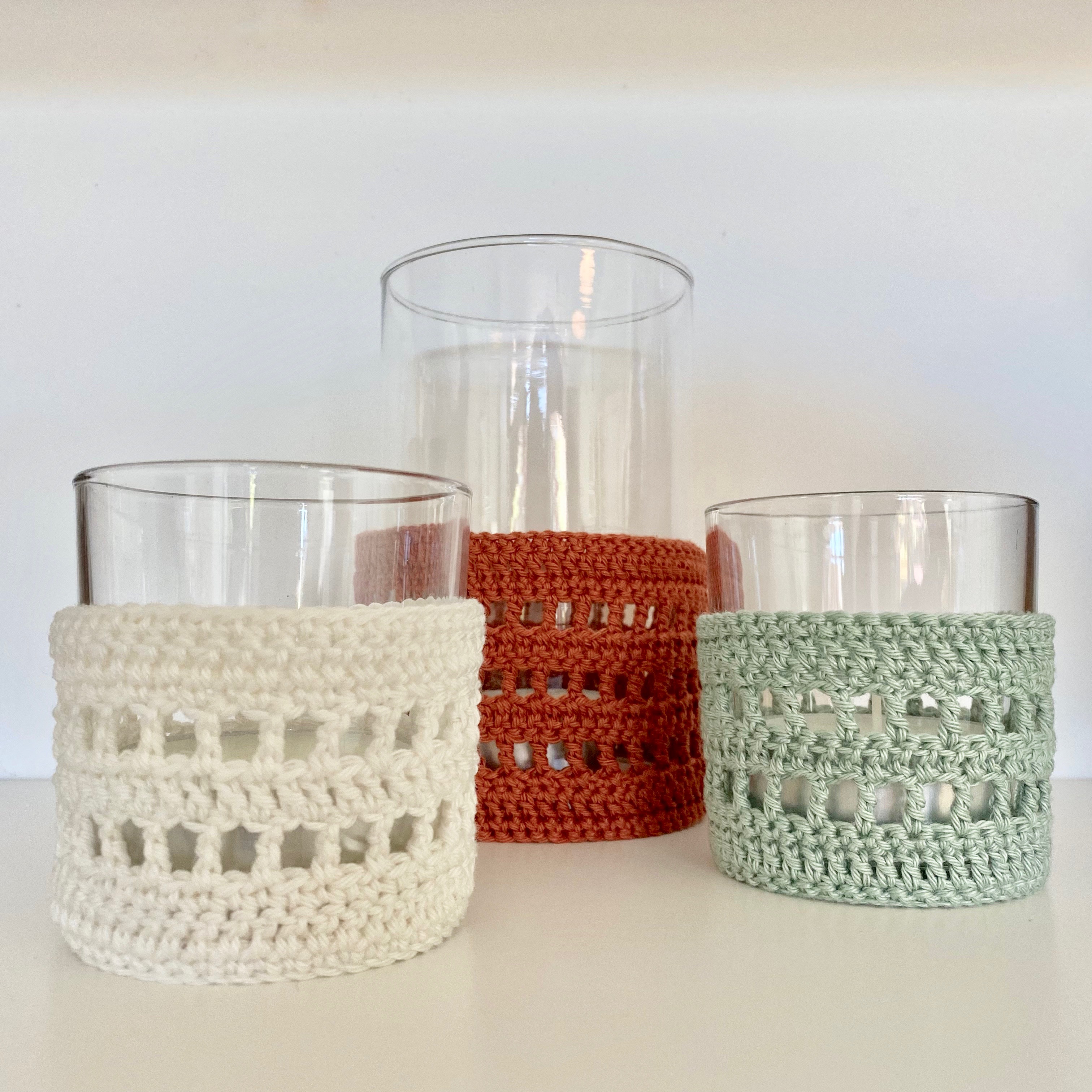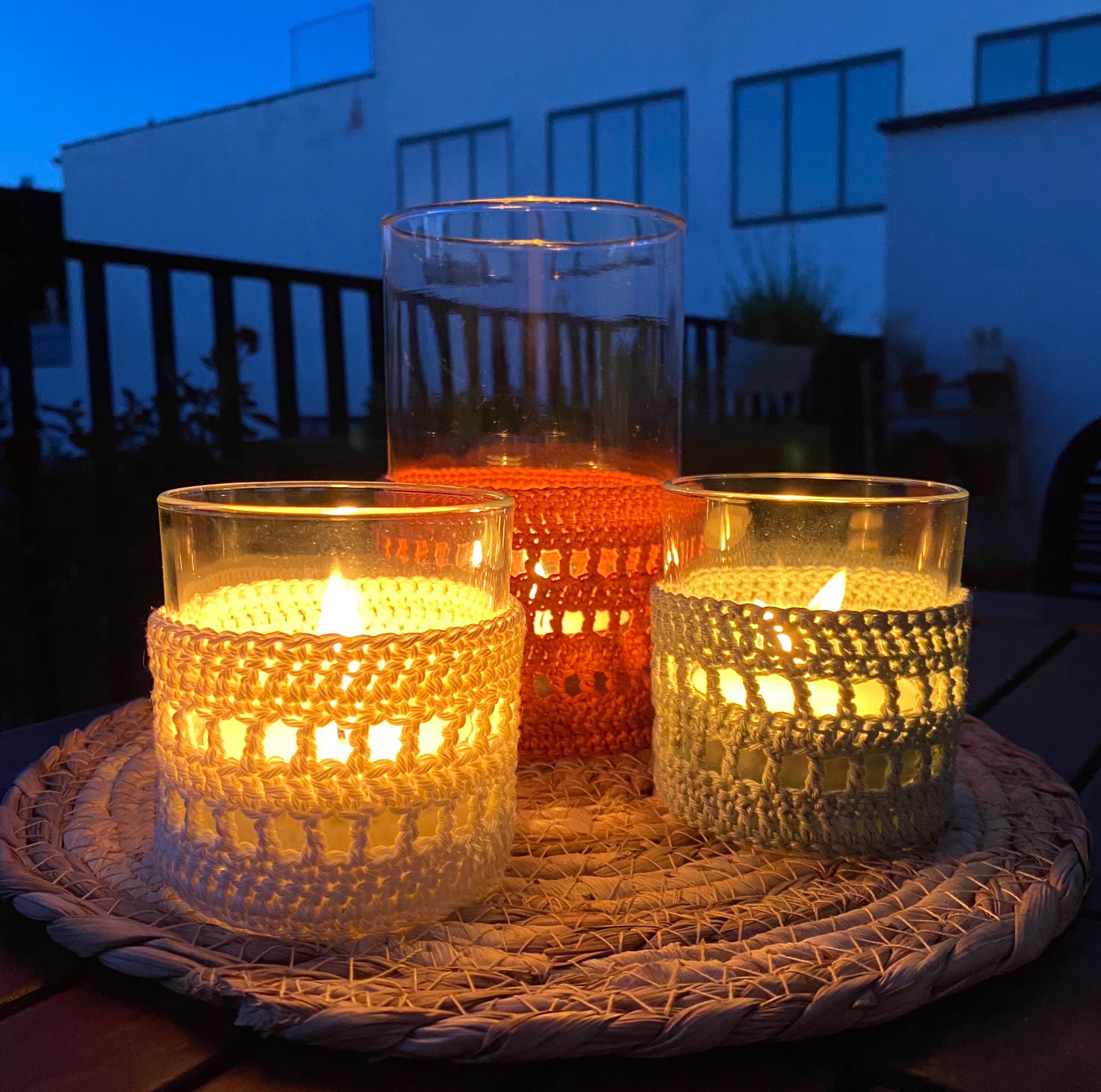 De windlichten staan zo leuk op je terras! Het licht schijnt door de gaatjes van de haakwerk waardoor het een mooi effect heeft op je tafel. Leuk om voor jezelf te maken of om iemand te verwennen deze zomer. Als basis kocht ik oude glaasjes in de kringloopwinkel om ze op te leuken.