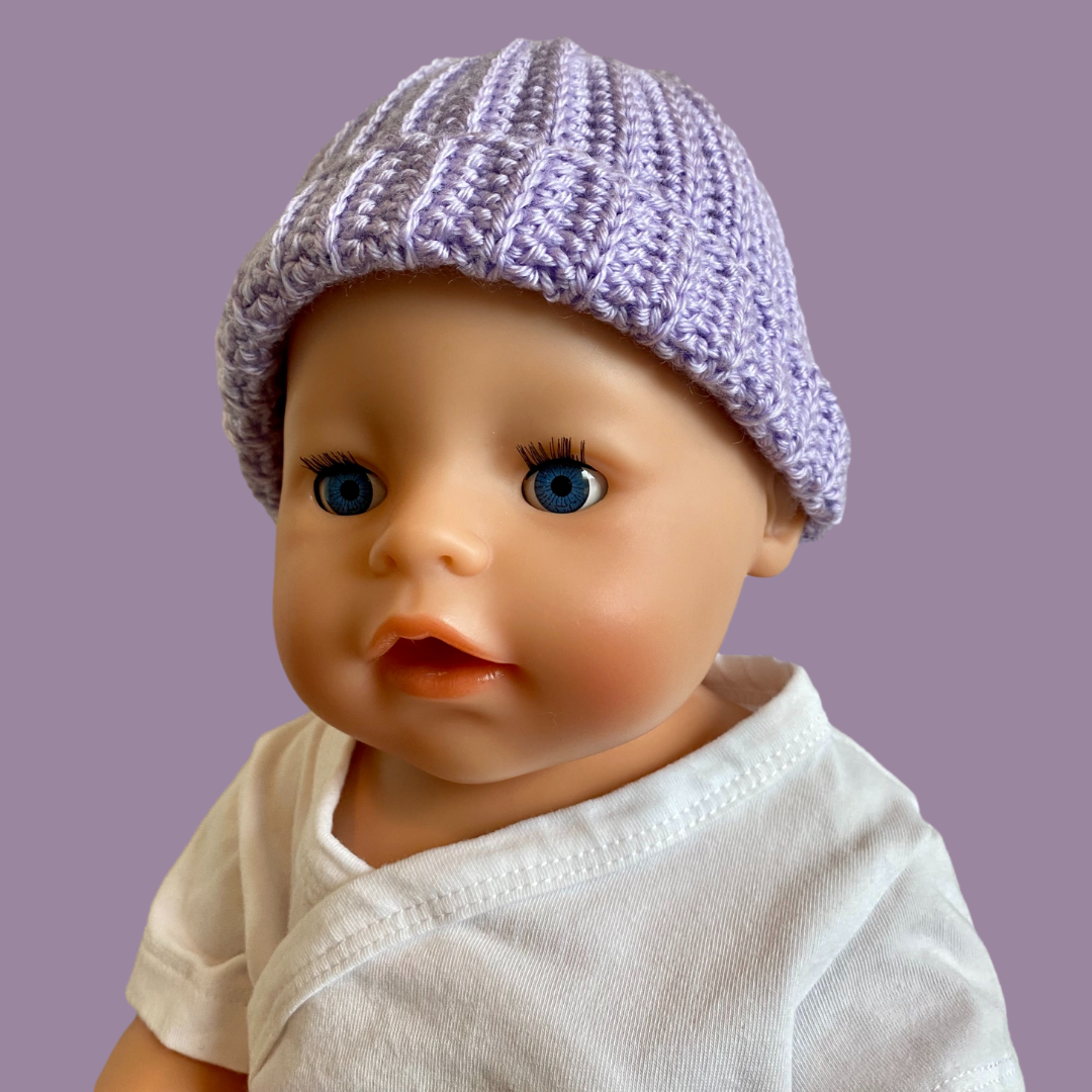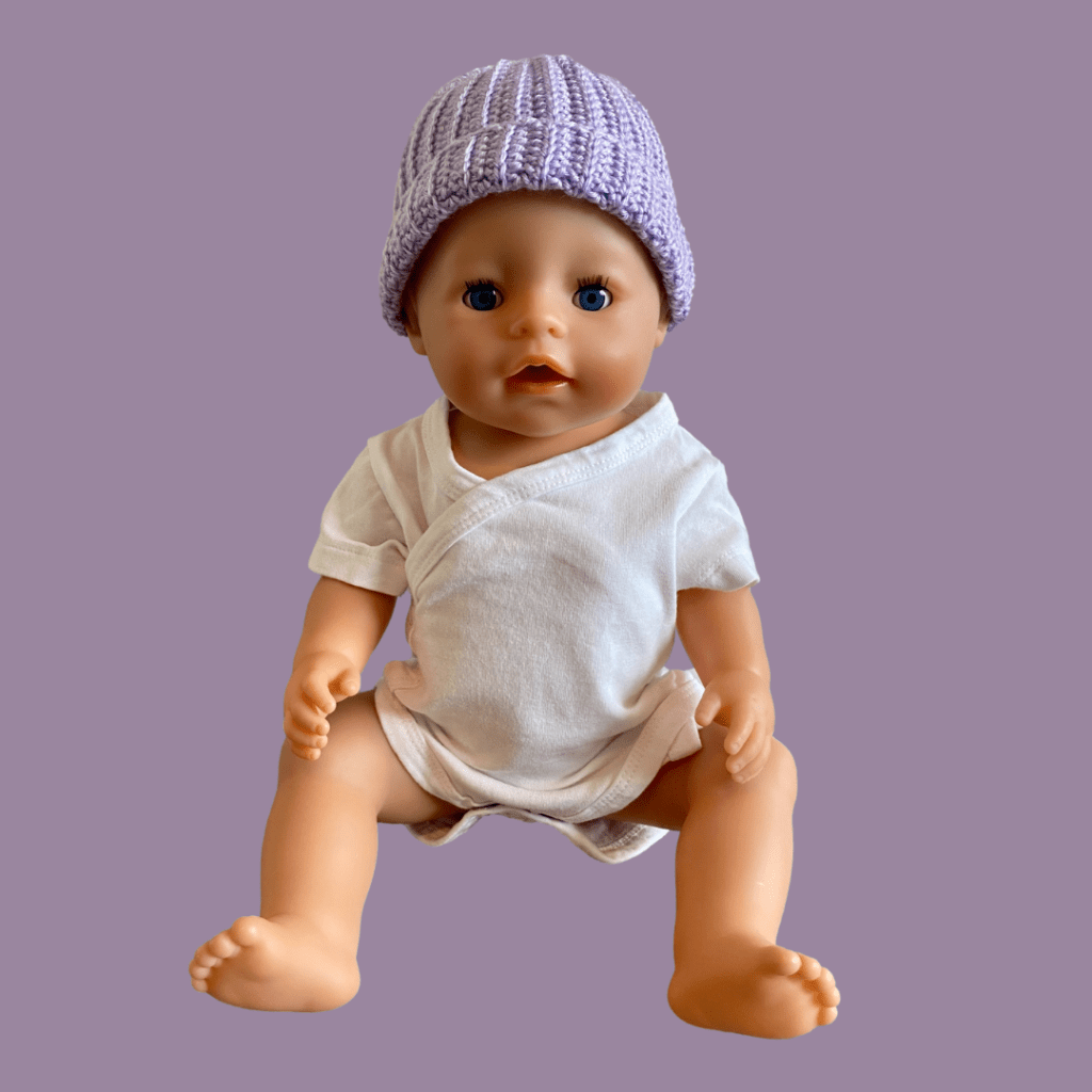 Haak een poppenmutsje! Het past voor een pop van ongeveer 45 cm. De omtrek van het mutsje is 32 cm, maar je kan het altijd groter of kleiner maken door rijen toe te voegen of weg te laten.