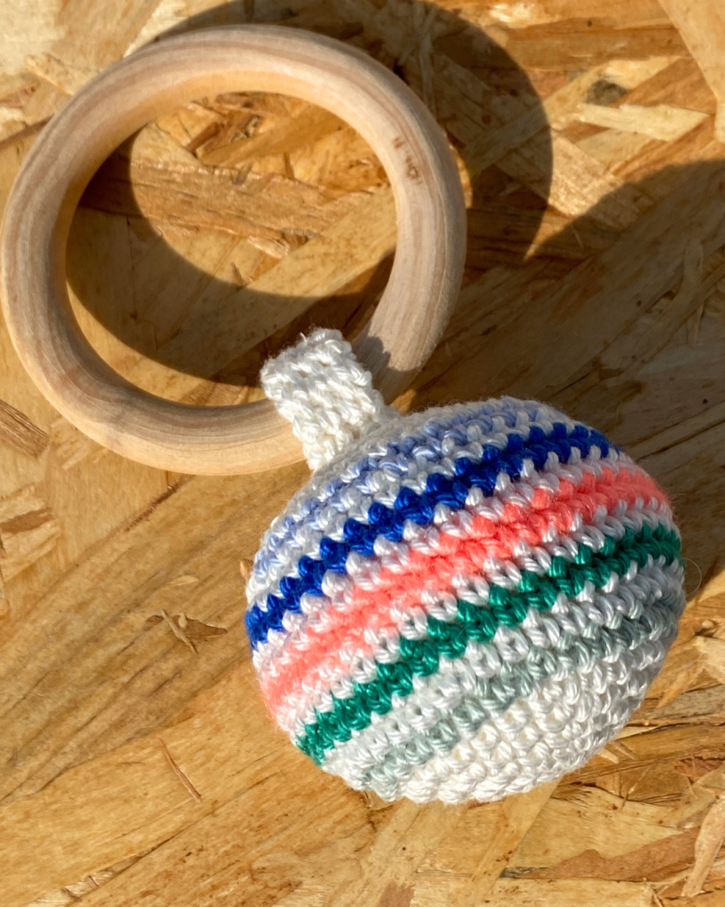 Deze schattige, zelfgehaakte rammelaar is het perfecte speeltje voor je baby! De zachte, handgemaakte afwerking is veilig voor kleine handjes, terwijl het leuke design en het vrolijke geluid de zintuigen van je kleintje prikkelen. Gemaakt van zacht katoen. Ideaal als eerste speeltje of als uniek cadeau voor een babyshower!