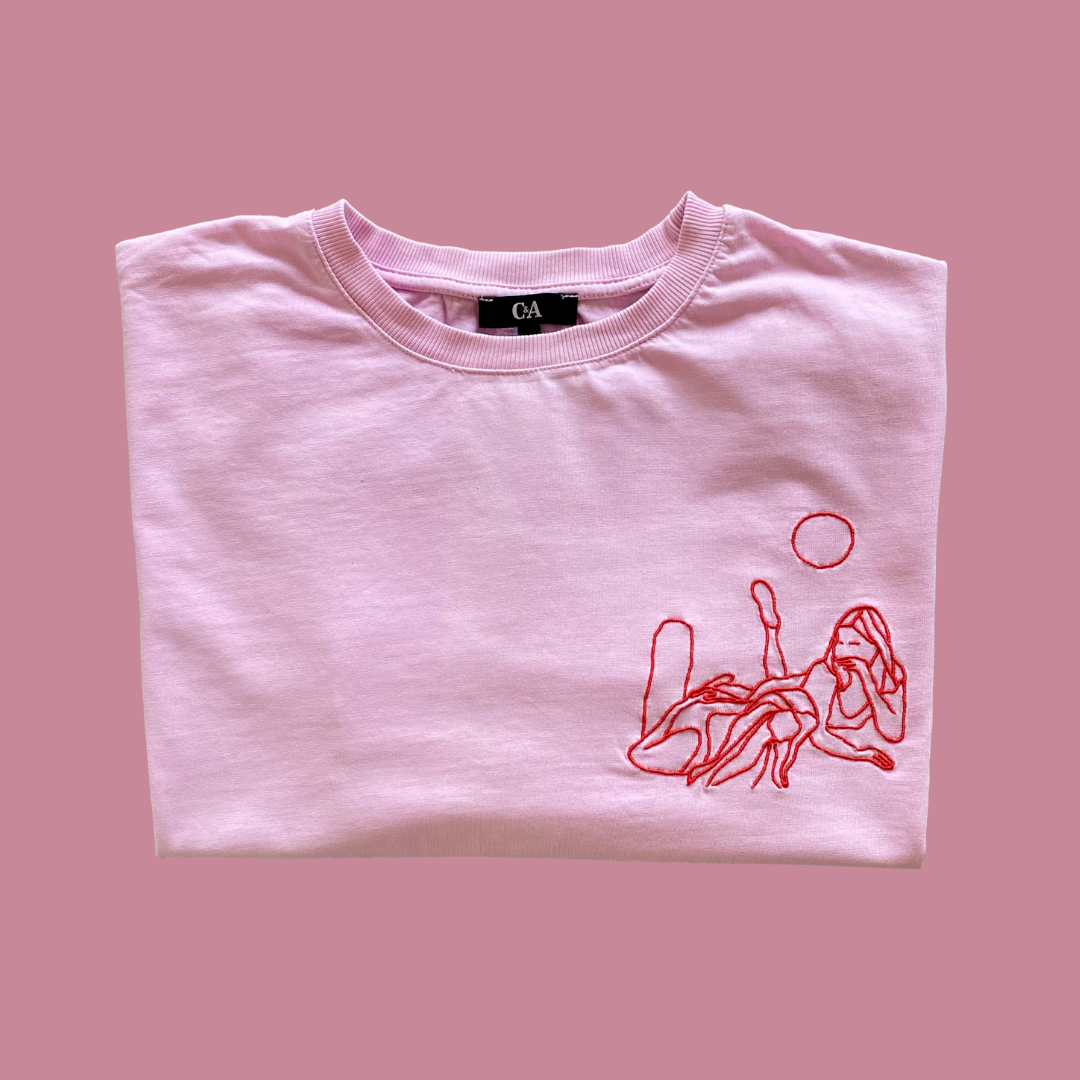 Laat een t-shirt personaliseren. Stuur een foto in, op basis daarvan maak ik een lijntekening die ik borduur in de gewenste kleur op het t-shirt.