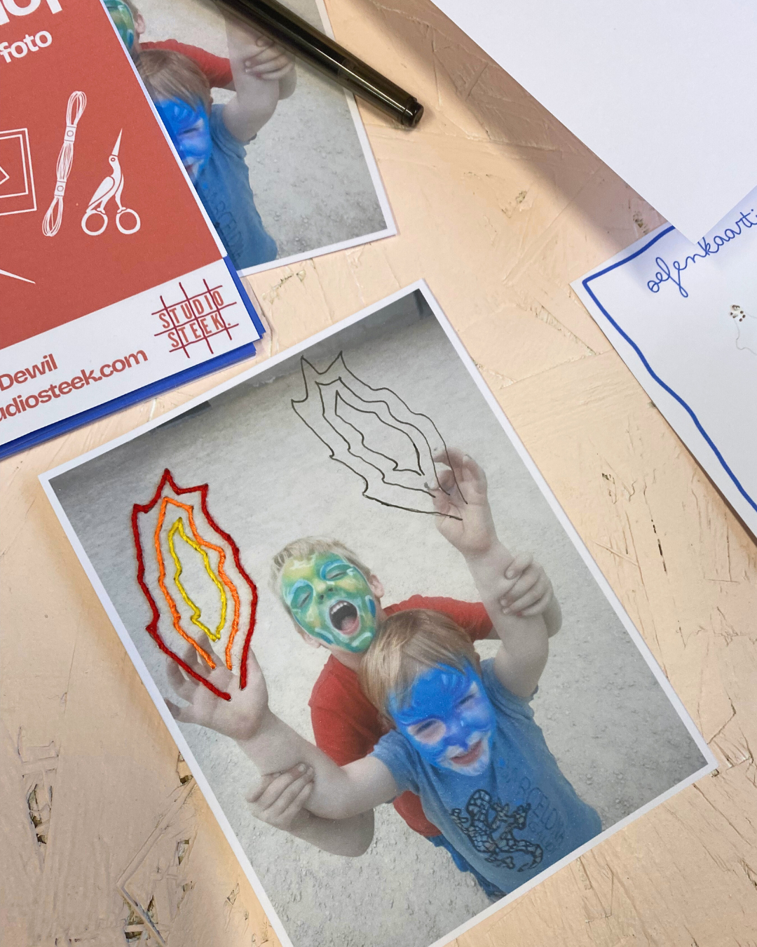 - Je kan ook iets extra tekenen op je foto en dit dan gaan borduren (zoals de bloemen op de foto met mijn broers hieronder: rechtse foto)